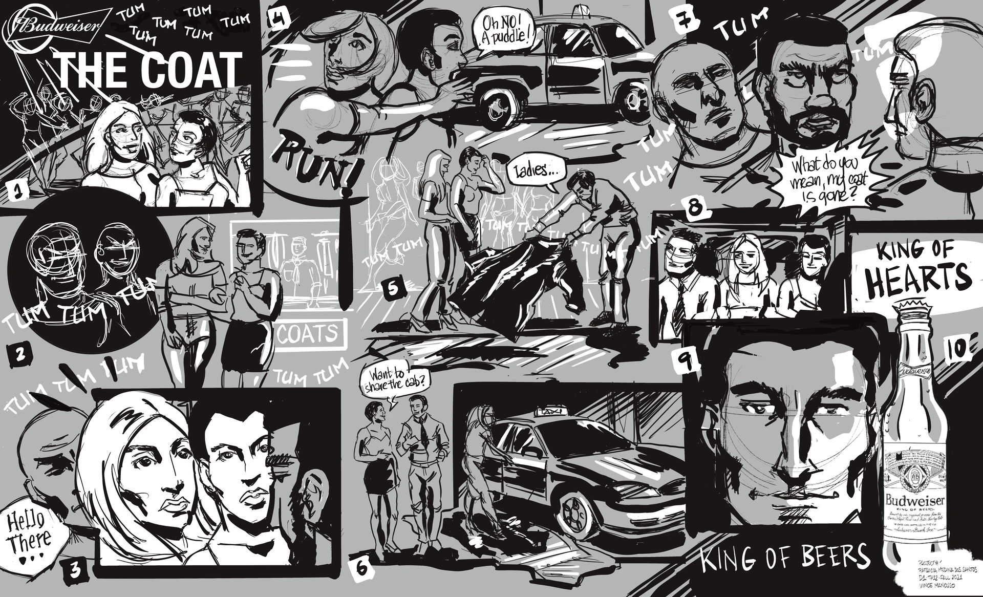 A concept board example that I created to show the basic anatomy of a Concept Board or Flow Board, used in advertising. It has similarity to a Comic Book or Graphic Novel.